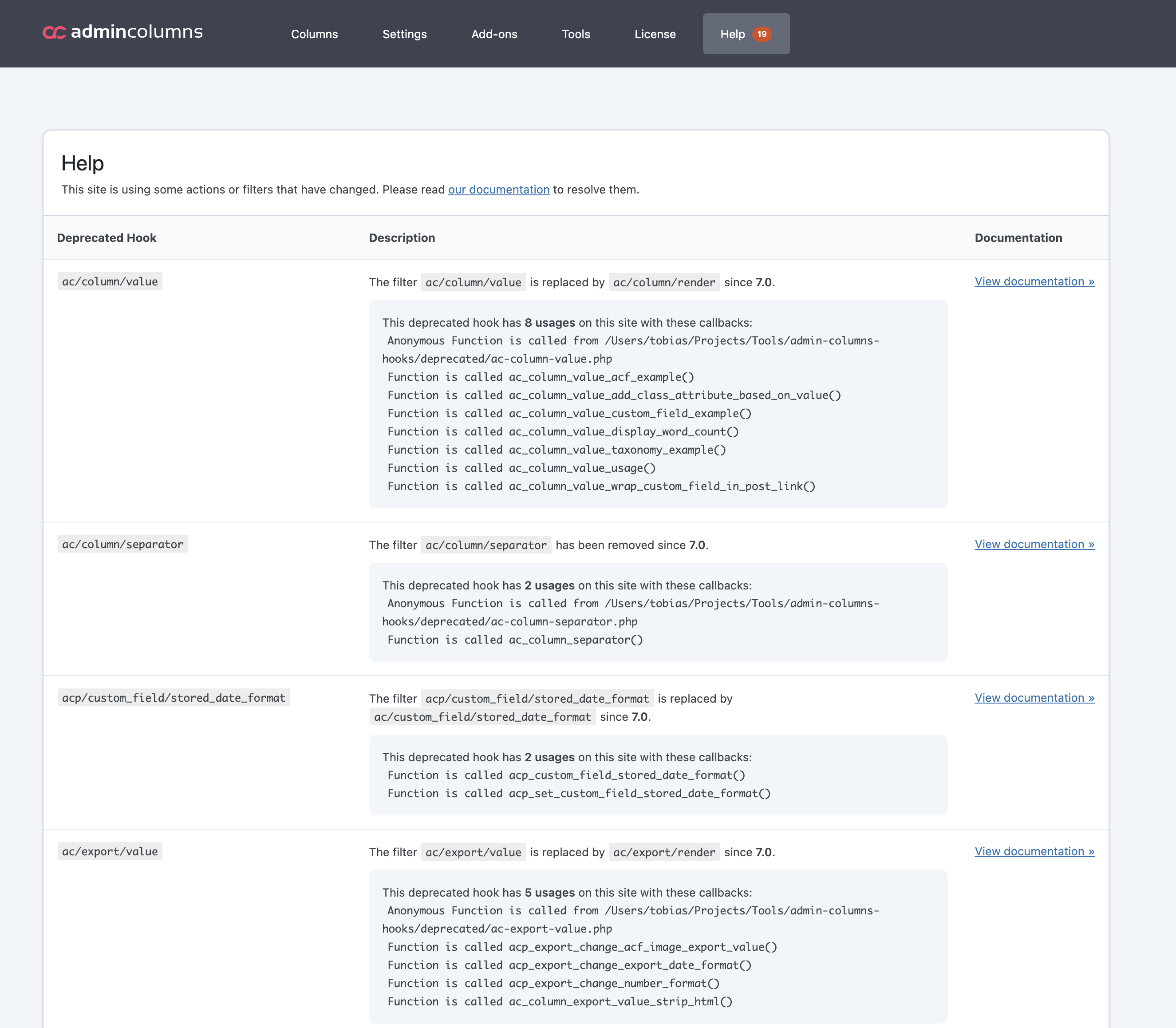 After upgrading to version 7, you can use the Help tab in Admin Columns to see which deprecated hooks or filters are used on your site and which replacements to use.