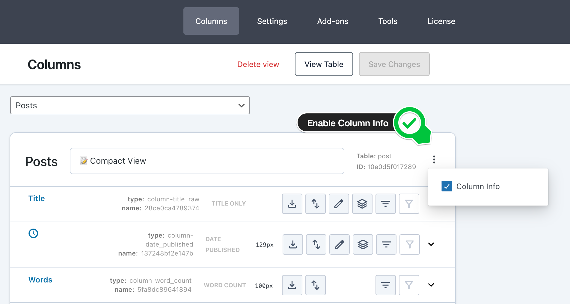 This show you the "Table ID and ListScreen ID" and the "Column Type an Name":